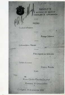 Menú del banquete servido en el club Cartagena en honor del coronel Charles A. Lindbergh con su autógrafo.