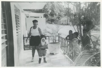 La donante con su hijo disfrazado en la puerta de su residencia.