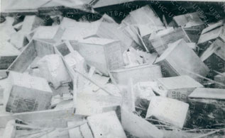 Descarrilamiento del tren, en las vías de la estación central del tren de Calamar. Se aprecian las cajas de la refinadora “Troco”. Cajas empleadas para almacenar insumos.