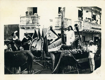 Aquí vemos uno de los varios carros alegóricos que participaron en los desfiles que se hicieron con motivo de las fiestas conmemorativas del primer centenario de la Independencia. El programa de estas celebraciones, se inició el día 10 con un Bando, y terminó el día 19, con concurso de disfraces, fuegos artificiales y un baile público que duró hasta las cuatro de la mañana del día 20 de noviembre.
