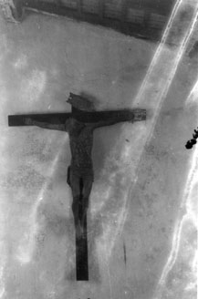 Estatua del Cristo crucificado tallado en madera, al interior de un convento no identificado.