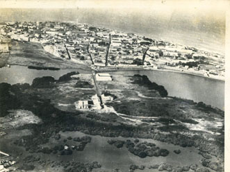 Vista aérea de Chambacú, aún sin viviendas. Al fondo se puede ver el centro amurallado con sus edificaciones.