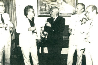 Jurados del festival de cine; de izquierda a derecha Álvaro Mutis Jaramillo, Gabriel García Márquez, Víctor Nieto Núñez, Vicealmirante Harold Delgado y Ricardo Vélez Pareja.