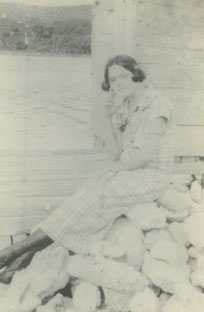 Una joven sentada sobre una pila de rocas cerca al agua /