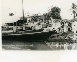 Aparece la embarcación “Codeco”, transportadora de madera, se aprecia el descargue de madera en la orilla de la bahía de las Ánimas.