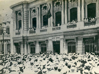 Manifestación frente al club Cartagena. La imagen permite apreciar la fachada de este hermoso edificio, diseñado por el arquitecto francés Gastón Lelarge, y construido bajo las administraciones de Enrique Grau Vélez y Daniel Lemaitre Tono. Fue inaugurado en noviembre de 1925.