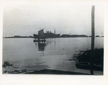 Velero nativo pasa frente a un Buque de guerra por la bahía.