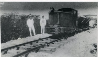 El señor Beckam, ingeniero jefe en las obras de la estación del ferrocarril, a su izquierda el señor Burton de la fundación Caright, y el motor de la gasolina en las vías.