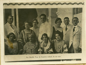 Aparece la señora Matilde Tono de Lemaitre rodeada de sus hijos; de pie: Ernesto, Teresa, Luisa, Daniel, Regina, Federico y Lili Méndez esposo de Regina. Sentados: Sabina, Matilde Tono de Lemaitre, Conchita y no identificado.