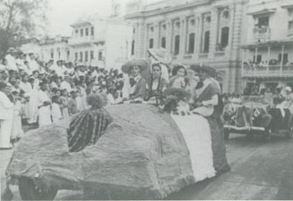 Se observa al fondo el antiguo Club Cartagena, en la carroza once de noviembre va la familia Paz Arrazola.