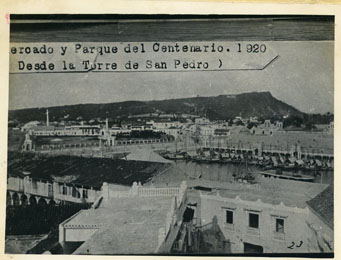 Mercado Público y el Parque Centenario. Visto desde la Torre de San Pedro, se aprecia la Bahía de las Ánimas y los veleros anclados, 1920.