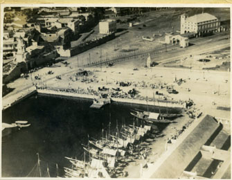 Vista aérea de la bahía de las Ánimas y el Muelle de los Pegasos. a un costado se pueden ver las barquetonas de vela que surtían de víveres al mercado de Getsemaní.En primer plano el mercado público de Getsemaní, Muelle de la Bodeguita. También está en el ángulo superior derecho de la foto la estación del ferrocarril Cartagena Calamar, en lo que hoy es La Matuna.