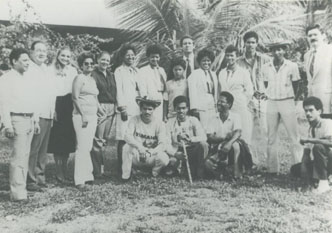 Agencia Conván de Rafael Maldonado. Podemos identificar en la derecha a Fabián de la Espriella, en el centro Ernesto Noceti, y de segundo a la izquierda a Rafael Maldonado. Les acompaña un grupo de música folclórica.