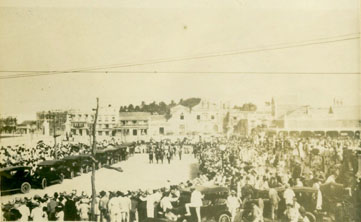 La llegada del infante Fernando de Baviera y Borbón príncipe de Baviera, a Cartagena. Se aprecian el Teatro Variedades, al fondo centro y a la izquierda Club Cartagena en construcción.