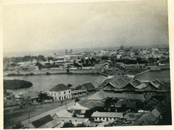 Panorámica del barrio El Espinal con el Corralón de Mainero, sector habitado por la familia Mainero Trucco, que estaba situada al pie del Puente Heredia, entre esta estructura y el Castillo de San Felipe de Barajas.