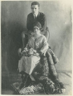 Doctor Alberto Henrique Torres De La Espriella, parado detrás de Sofia Teresa Stevenson Maciá, sentada en silla de mimbre, decorada con flores artificiales, sus pies sobre un cojín con piel.