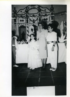 Johana Tatis en el día de su primera comunión, acompañada de Leonor Castilla su profesora y la rectora del Colegio La Milagrosa, Cecilia.