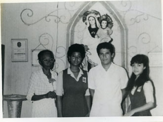 Grado de María Eugenia Buendía en el colegio Nuestra Señora del Carmen, aparece el profesor, una amiga y su madre.