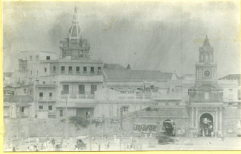 La Torre del Reloj, atrás edificios en la Plaza de los Coches, la cúpula de la Catedral casi terminada.