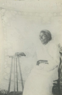 Una señora sentada sobre lecho colgada.