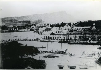 El Muelle de los Pegasos, la bahía de las Ánimas, el Parque del Centenario, al fondo el Cerro de la Popa, Cerro de San Lázaro y las iglesia de la Tercera Orden, San Francisco y Veracruz.