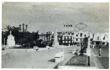Camellón de los Mártires, al fondo edificio del hoy Hotel Monterrey, y los teatros Cine Colombia, ya desaparecidos hoy.