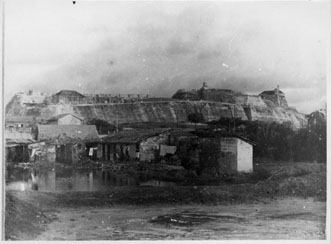 Casitas en Chambacú con el Castillo de San Felipe al fondo.