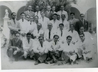 Doctor Nicolás Macario Paz Ferrer, junto a colegas médicos en el patio de Universidad de Cartagena, en sede del Claustro de San Agustín, el doctor Macario fue alcalde seccional de gobierno, director del Hospital Santa Clara y profesor de la universidad de Cartagena.