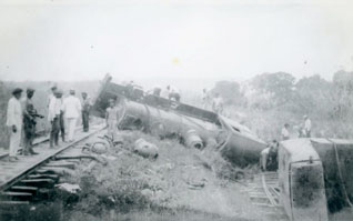 Descarrilamiento del tren, en las vías del ferrocarril, se aprecian la locomotora volcada a medio lado, accidente ocasionado en Calamar.