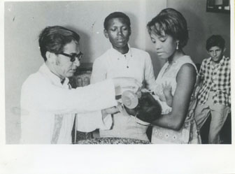 Aparece el bebé Agustín Ramos, su madrina Ernestina Amador y Pedro de Arcos en el bautizo.