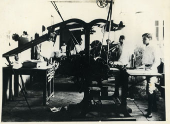 Interior y máquinas de los talleres de la Litografía Mogollón y un grupo de empleados trabajando.