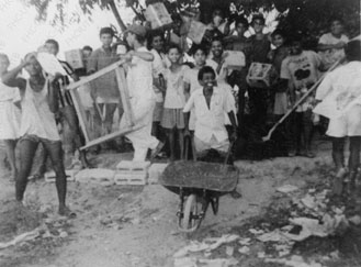 Alumnos del colegio y padres de familia colaborando con la obra civil del Colegio Tiquisio el Coco.
