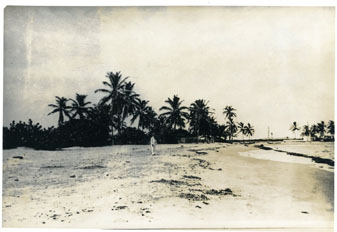 Playas de Bocagrande, de arena dorada, bordeada por muchas palmeras y un hombre observa a lo lejos. Se aprecia casa de empleado de The Andian Corporation al fondo.