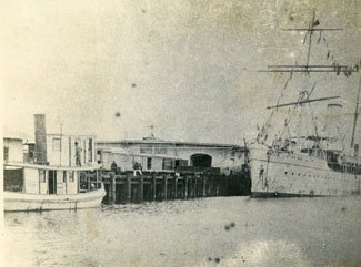 El barco de vapor de nombre Río de Janeiro anclado en el Muelle de la Machina, donde fue transportado el monumento en homenaje a Cristóbal Colón, en el año 1895.