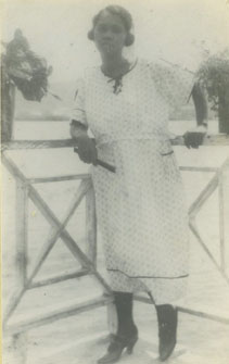 Una señora apoyada contra una baranda sobre el agua.