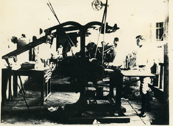 Talleres y maquinarias de los talleres de la Litografía Mogollón, empleados trabajando.
