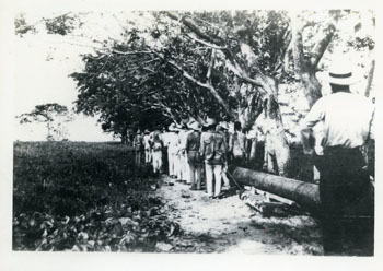 Trasladando un tubo del puerto de Cartagena a la estación de Santana. Todavía no se usaban tractores, durante el tendido de la tubería del oleoducto Barrancabermeja a Mamonal, en Cartagena, construido por Andian entre 1923 – 1926.