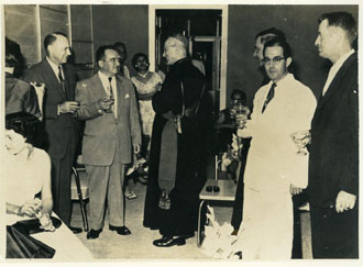 Inauguración Hospital Bocagrande. Mary Ospina, Dr. Domingo Vargas, F. Carmona, Magola Alarcón, Arzob. López U., Dr. Hernando Espinosa Paris, Joe Rowlings.