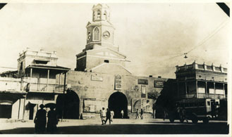 Plaza de los Coches, todavía con tráfico automotor a través de sus puertas de entrada, y con casas adosadas a la muralla. La casa de dos plantas, a la derecha, sería más tarde sede de la Alcaldía Mayor, hasta que fuera incendiada durante las revueltas del 9 de abril de 1948.