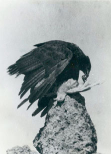 Un gavilán en su estado silvestre, sostiene en sus fauces un ave producto de su caza.