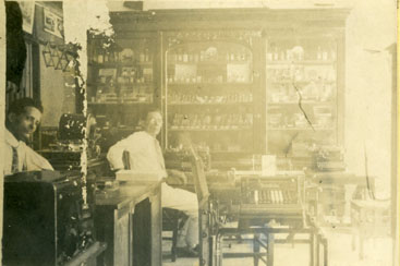 Interior de la Botica Villarreal, frente al Parque del Centenario, en el barrio de Getsemaní. Con dos dependientes.