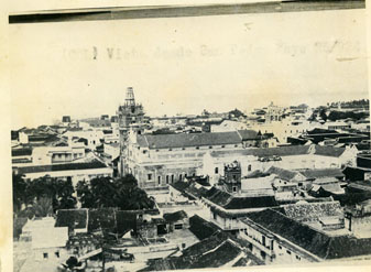 Panorámica del Centro Histórico desde una de las torres de la Iglesia San Pedro Claver. En el centro de la imagen vemos la Catedral, cuya cúpula en construcción es una de las obras representativas de la llamada arquitectura republicana. Está cúpula, así como la de la iglesia San Pedro Claver, fueron obra del arquitecto francés Gastón Lelarge. La foto trae la fecha mecanografiada, todavía legible: mayo de 1924.
