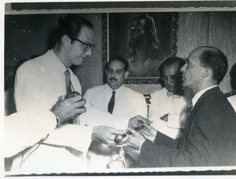 Rafael Escallón hace entrega del bastón de mando de la Alcaldía a Haroldo Calvo Núñez. De izquierda a derecha Rafael Escallón Villa, Eduardo Lemaitre Román, sin identificar, Haroldo Calvo Núñez.