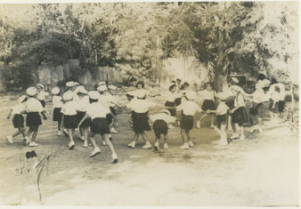 Niños jugando en el patio del colegio con gorras de marinero.