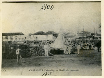 Muelle del mercado de Getsemaní, sobre la bahía de las Ánimas. Una pila de leña, las barquetonas de vela utilizadas en el comercio de cabotaje, y algunos señores vestidos de dril blanco sobre el muelle.