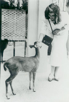 Susana Caldas Lemaitre señorita Colombia en 1986, acaricia un venadito en los patios del Hotel Caribe de Cartagena.