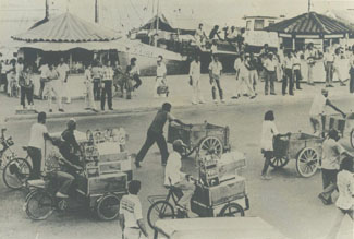 Vendedores ambulantes en marcha hacía Bocagrande, al fondo el Muelle de La Bodeguita.