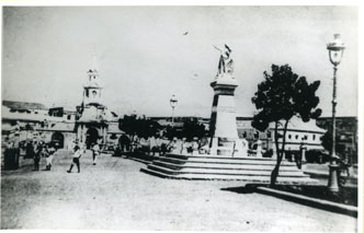 Camellón de los Mártires, se aprecia el monumento en el centro del parque, y al fondo la Torre del Reloj.
