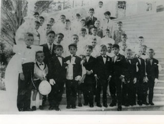 Aparecen un grupo de estudiantes del colegio Salesiano; con traje de primera comunión.