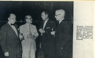 Durante homenaje de ex-empleados del Andian al gobernador Doctor Torres, aparecen los señores Henry Bentley, el gobernador del departamento. Paul Ratliff y un ejecutivo de Intercol.